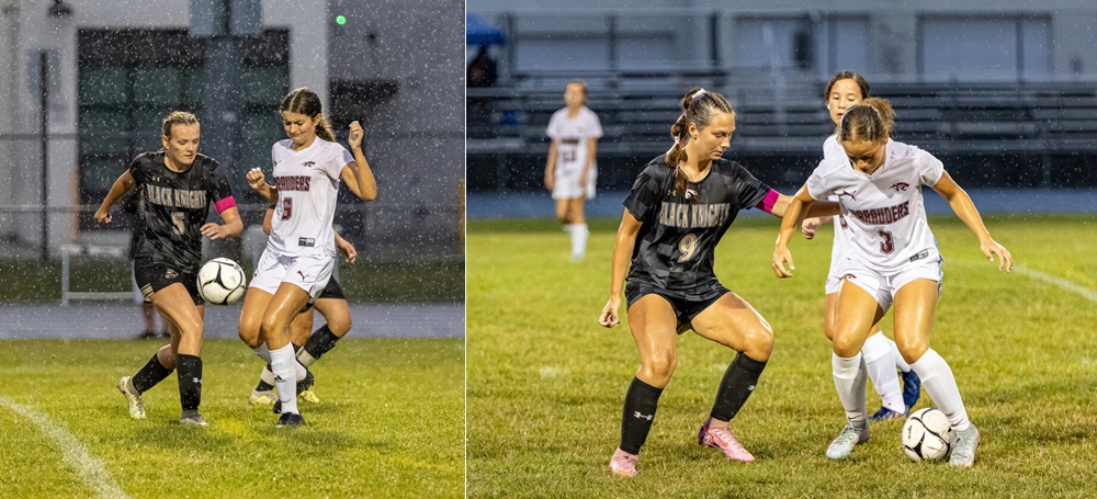 OBSERVER Photos by Sideline Images of WNY Above, left, Silver Creek/Forestville's Carilene Sliwa and Dunkirk's Kamdyn Earring battle for possession during Wednesday's CCAA Division 3 girls soccer game in Silver Creek. Above, right, Dunkirk's Chianti Lopez attempts to dribble around Silver Creek/Forestville's Hailie Rybij during Wednesday night's CCAA Division 3 game in Silver Creek.