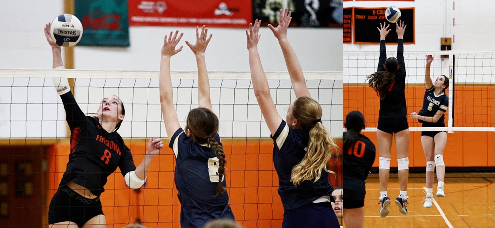 Photos courtesy of Steve Garvey Above, left, Fredonia's Londyn Wilmot spikes the ball against Falconer in CCAA Division 1 action Wednesday. Above, right, Fredonia's Alyse Bugaj attempts to defend a hit by Falconer's Kaylee Green during Wednesday's CCAA D1 volleyball at Fredonia High School.