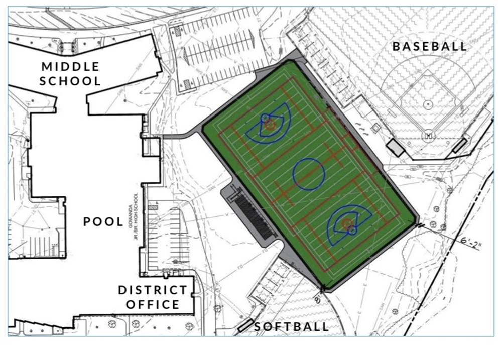 The most costly improvement at the Middle/High School campus is a $10.2 million turf lacrosse field, including stadium lights, bleachers that seat 500 people, a scoreboard, netting behind the crease, and fencing around the perimeter. The field's primary design would be for lacrosse, but it could be utilized as a football field, as well, especially for practices and youth contests.