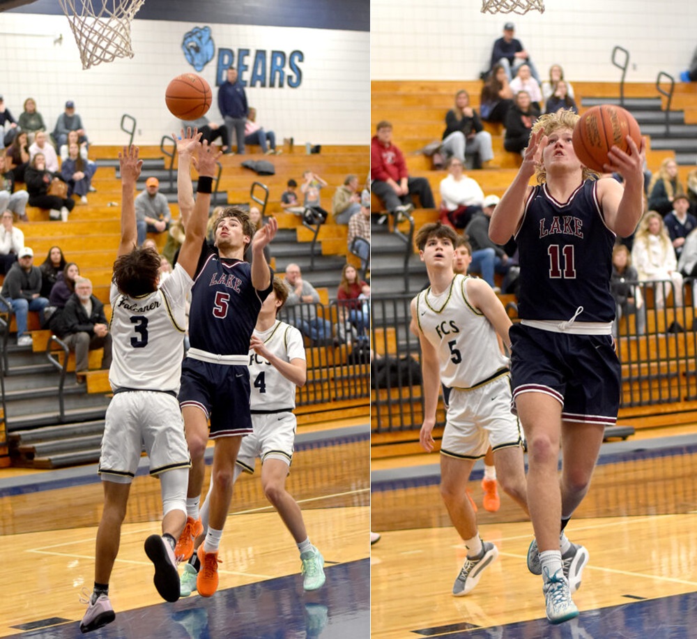 OBSERVER Photos by Matt Spielman Above, left, Chautauqua Lake's Brayden Gibbs shoots over Falconer's D’mitri Carlson (3) during the opening round of the Frewsburg Holiday Tournament on Friday in Frewsburg. Above, right, Chautauqua Lake's Asher Olson puts up a reverse layup against Falconer during the opening round of the Frewsburg Holiday Tournament on Friday in Frewsburg.
