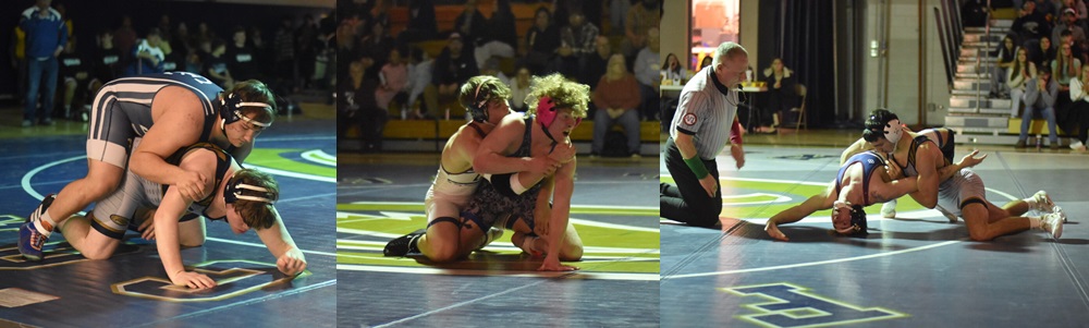 Avove, left, Chautauqua Lake/Westfield/Panama/Clymer's Walter Lukasiak works on top of Falconer/Cassadaga Valley's Hunter Hattaway during the 285-pound bout Wednesday in Falconer. Above, center, Chautauqua Lake/Westfield/Panama/Clymer's Alex Bourgeois works behind Falconer/Cassadaga Valley's Nicholas Russell during the 144-pound bout Wednesday in Falconer. Above, right, The Golden Cougars' Dylan Newman works on a pin of the Eagles' Logan Fuller. OBSERVER Photos by Christian Storms