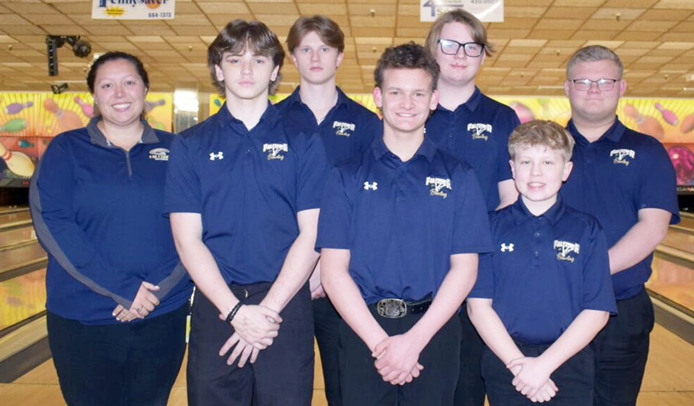 The Falconer boys bowling team finished first in Chautauqua-Cattaraugus Athletic Association Division 1 with a record of 32-8. Pictured, from left to right, are Coach Emily Narraway, Tyler Swanson, Erik Stenstrom, Trevor Lincoln, Aiden Peters, Mason Simon and Joshua Lincoln. OBSERVER Photo by Christian Storms